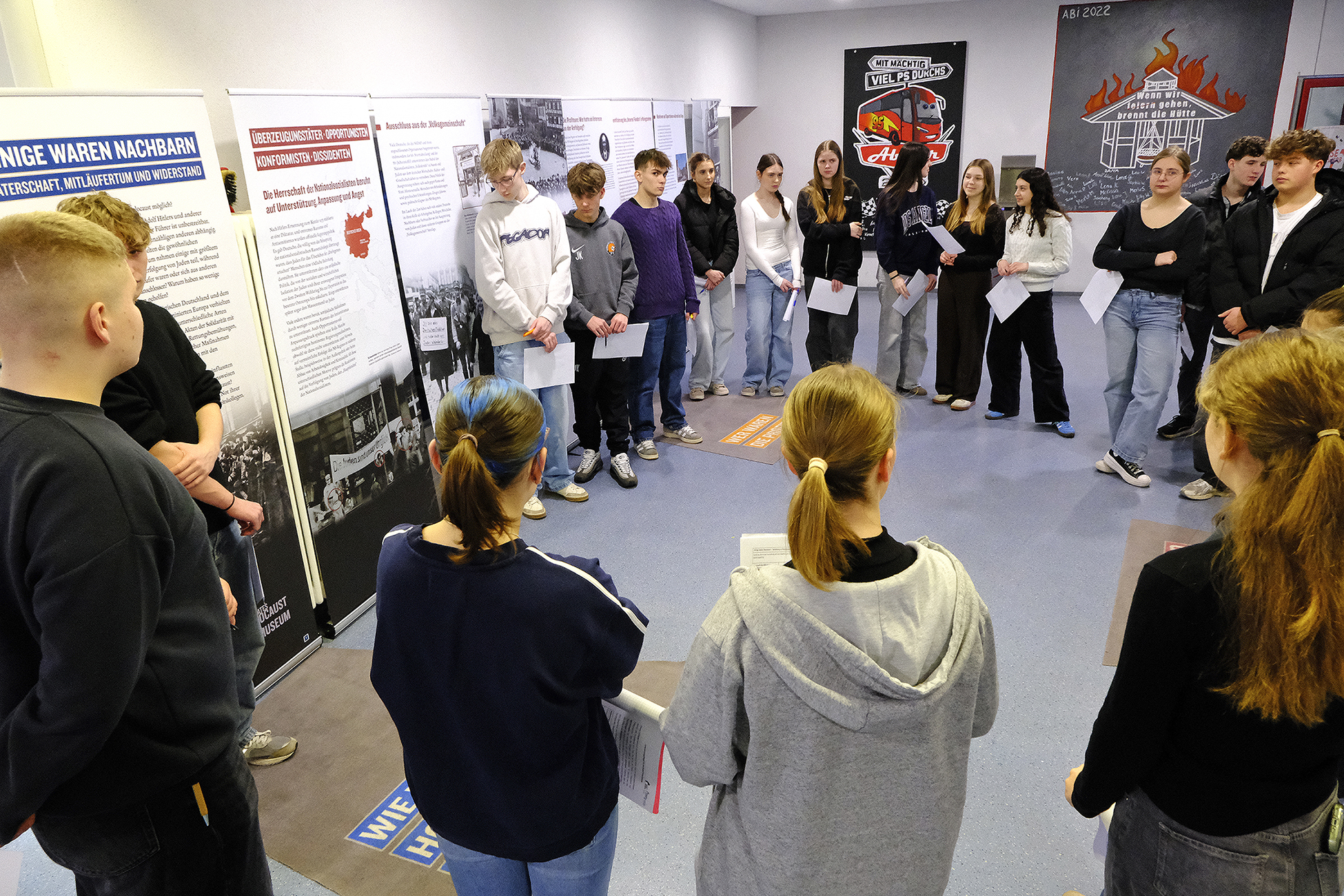 Im Februar fand am Gymnasium Birkenfeld der von der Fachschaft Geschichte organisierte Demokratietag für die Klassenstufe 10 statt. Rund um die Wanderausstellung „Einige waren Nachbarn“ des United States Holocaust Memorial Museums Washington D.C. (USHMM), die dem Gymnasium von der Gedenkstätte KZ Osthofen zur Verfügung gestellt wurde, erhielten die Schüler einen tiefen Einblick darin, wie es zum Holocaust kommen konnte. Neben der Ausstellung informierten eine Lesung und der Dokumentarfilm „Ganz normale Männer“ die Schüler über dieses dunkle Kapitel deutscher Geschichte.