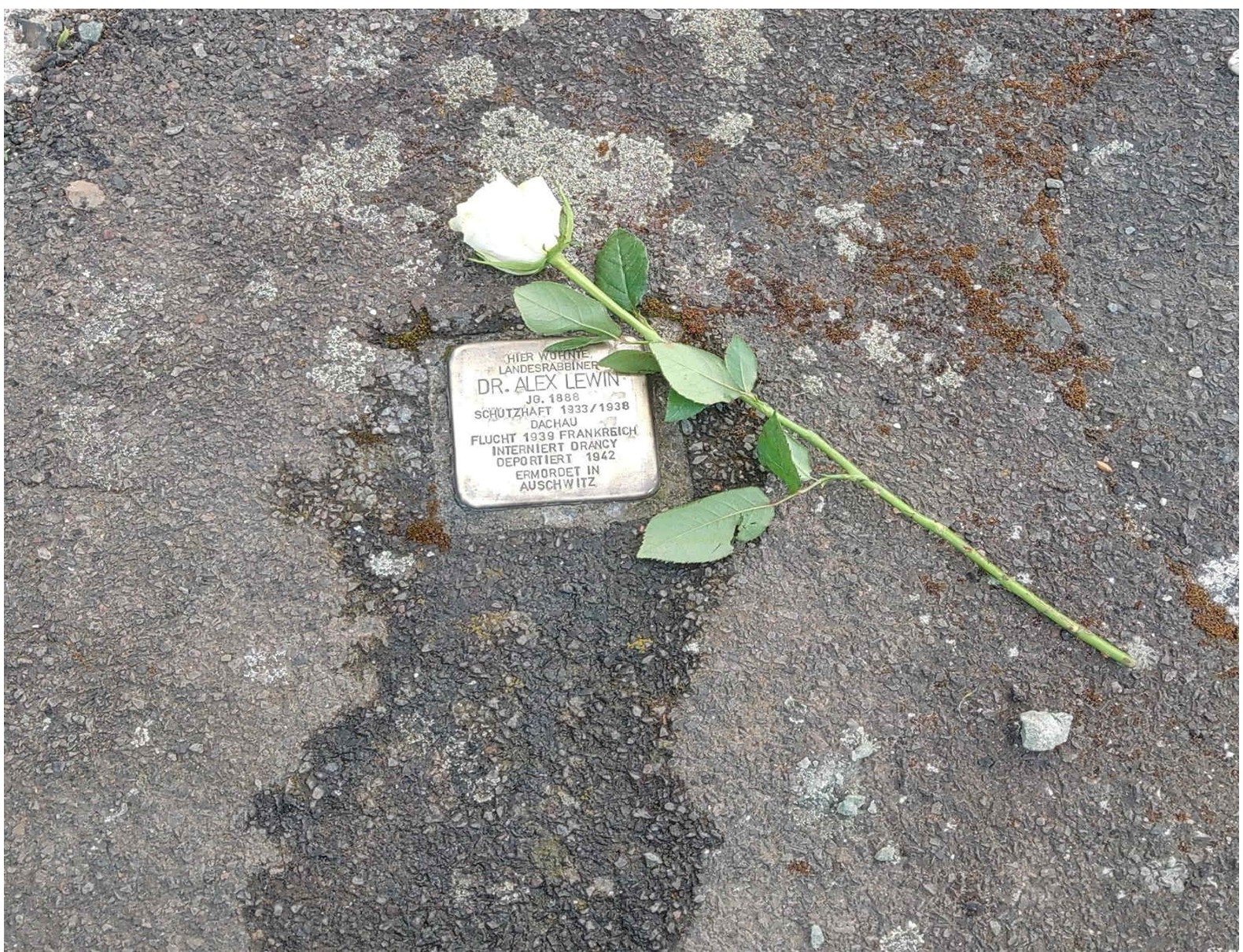 Die AG engagierte sich auch für die Familie Stern. 2018 wurden Stolpersteine für Landesrabbiner Dr. Alexander Lewin und sieben Familienmitglieder verlegt. Eine bewegende Abendveranstaltung informierte über ihre Leben und Schicksale.